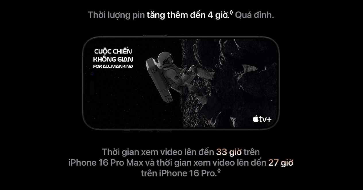 Với thời lượng pin kéo dài đến 27 giờ, iPhone 16 Pro đảm bảo bạn có thể sử dụng thoải mái suốt cả ngày mà không phải lo lắng về việc sạc pin. Dù là làm việc hay giải trí, iPhone 16 Pro luôn sẵn sàng đồng hành, giúp bạn tập trung vào những gì quan trọng mà không bị gián đoạn.